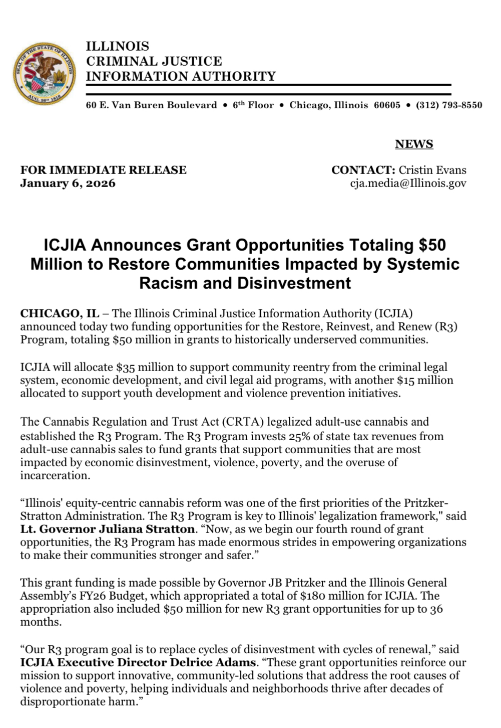 ICJIA has announced that applications are open for new Restore, Reinvest, and Renew (R3) grant opportunities totaling $50 million for Illinois communities.